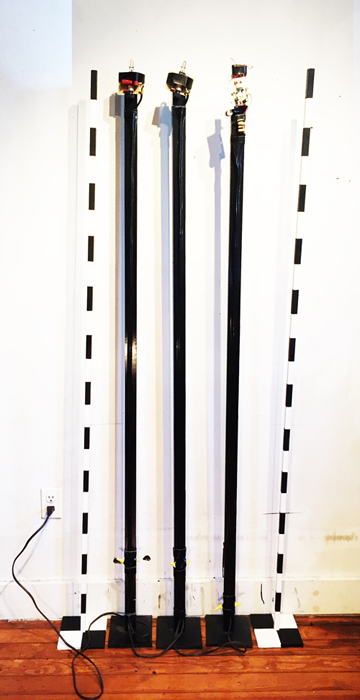 - 6' tall wooden staff -party strobes The strobes are wired in such a way as to produce a synchopated pulse patern.